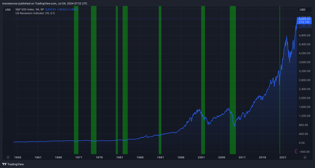 Through the past decades, there were many reasons to be fearful. Highlighted in green above are the periods of economic recessions.
