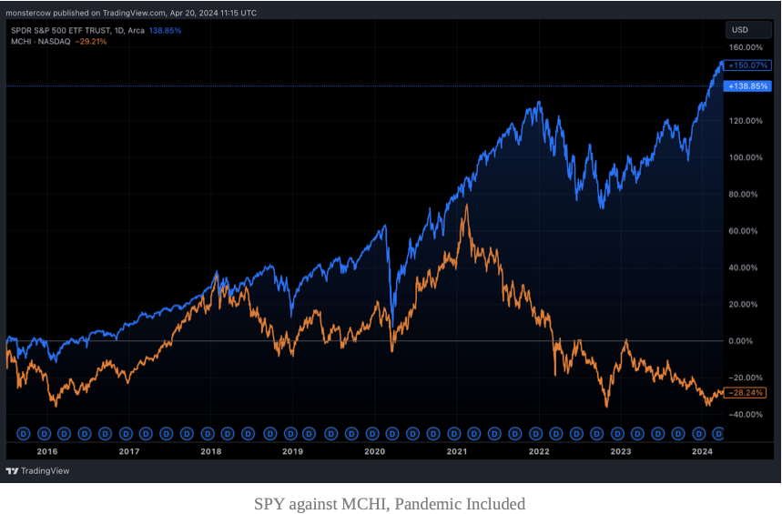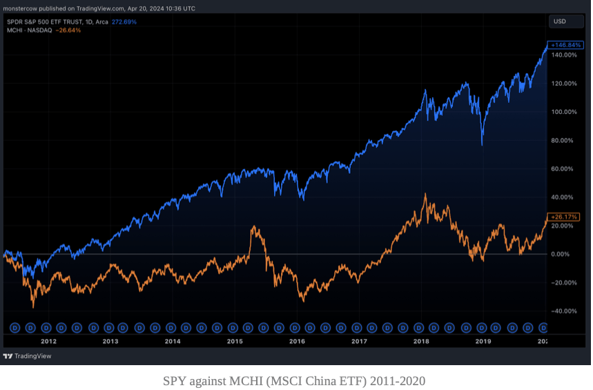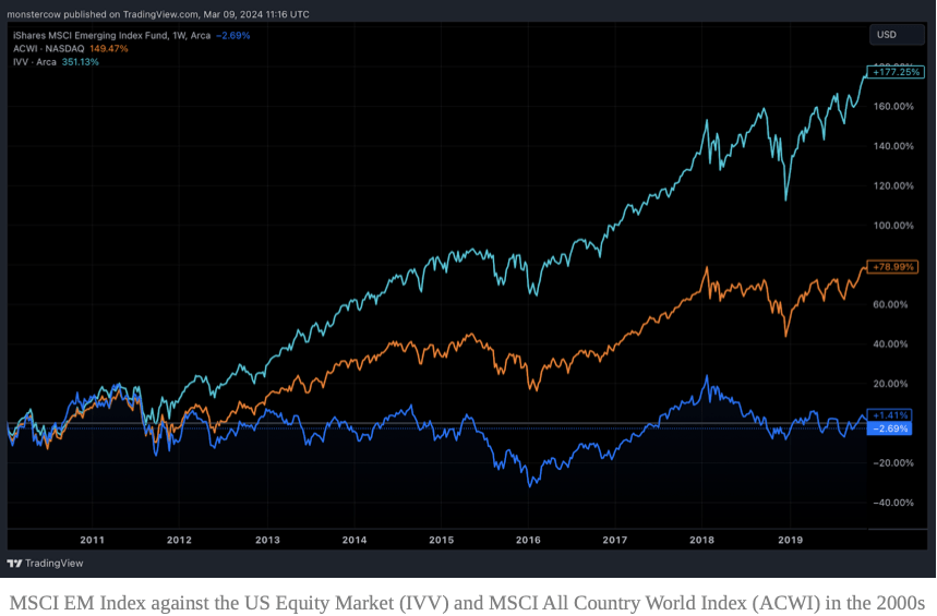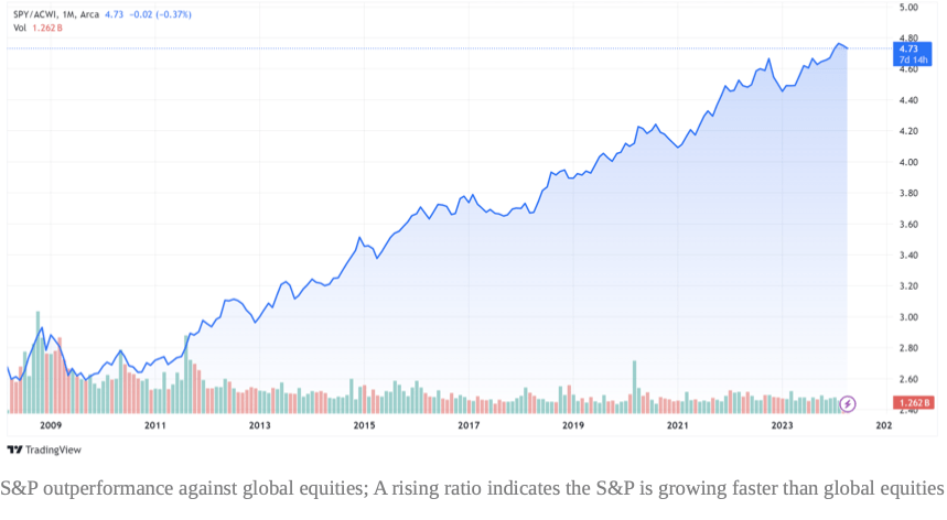 US equity outperformance is not limited to the Chinese equity markets. Since the Great Recession, the S&P has tactically outperformed global equities consistently. If we were to look at the past decade, the US S&P exponentially outperformed the Emerging Markets (EM) index as well as global equity benchmarks (ACWI). Note that the ACWI is largely overweight US equities still.