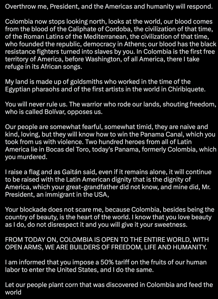 I also strongly disagree with the implications of a common school-of-thought regarding the use of Trump’s aggression on the international stage. This perculiar justification contends Trump is ostensibly aggressive in a Door-in-the-face manner to bargain for American interests, i.e. threats to Canadian, Greenland’s sovereignty to secure favourable policy implementations. This cannot be the case, and is unbecoming of a major politician who is unable to adhere to the pro formas regarding diplomacy. The only effect Trump will reap is to push non-aligned nations to the Eastern bloc and weakening partnerships around the world. This was a tweet just earlier this day by the Columbian President Gustavo Petro. In what world does this sound like the Trump aggression is working?