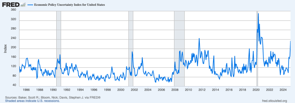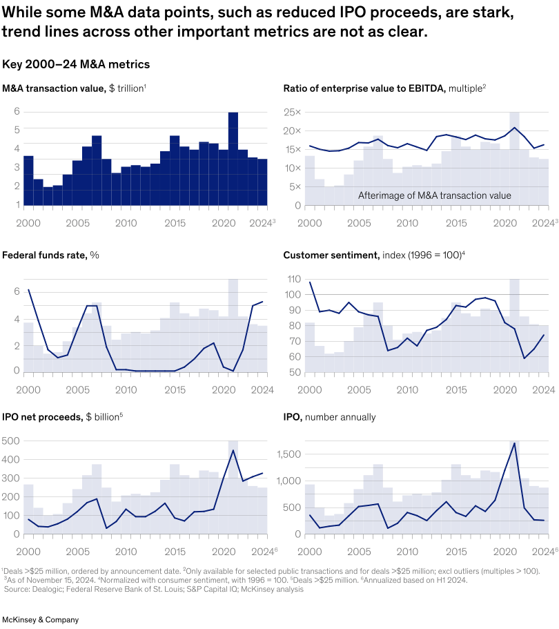 The ambivalence surrounding the higher-for-longer rates environment, elevated uncertainty (at levels only observed during the Great Financial Crisis and the Covid-19 Pandemic), with yet a continuation of the historic spread compressions has been off-putting for investors particularly in the private markets, particularly those who have been looking for attractive exit opportunities presumed to arrive in the Trump Administration. Exit multiples continue to stay in line with decades trends, we see a contraction in the PMI and Consumer Confidence, and a wait-and-see attitude that is damaging the performance of GPs.