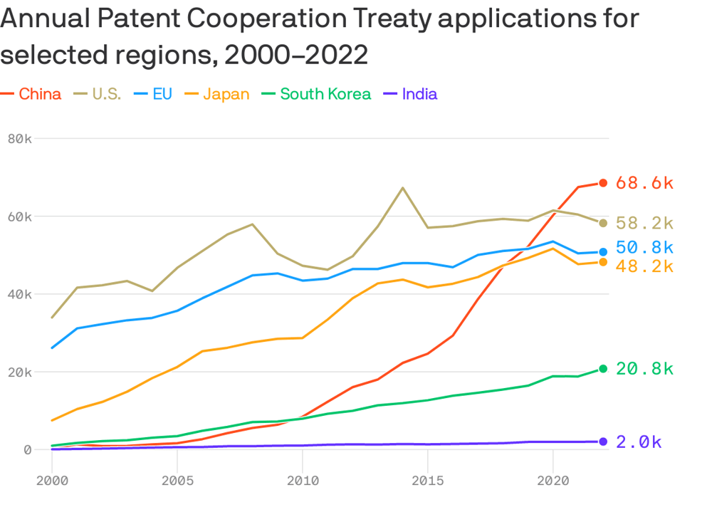 Why is such innovation not shocking? Within the past decade, China has overtaken the US in international patent fillings and seen its AI-related patents balloon from 650 in 2012 to over 40,000 by 2022 — approximately four times that of the US. China today leads the world in AI patent output, especially in areas including machine learning and computer vision.