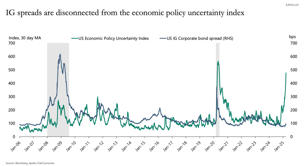 Traditionally, investors have characterised the US as having negligible political risk and bestowing it the safe-haven status. Today, we have to apply the same political risk metrics we use elsewhere: institutional quality and resilience, political predictability, societal stability metrices … which the US still scores highly on most; but the margins of safety have shrunk. For instance, where we might have held overweight duration in the past during bouts of elevated uncertainty, we now consider neutral or underweight duration, prefering other safe assets including Gold and regional investment-grade credit as a small adjustment and not an overhaul.