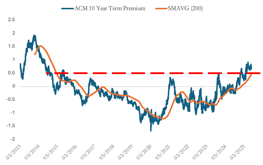 If the US chooses not to Japanify by inflating their debt away and punishing bond holders through a rampant credit creation cycle, concerns over fiscal sustainability trends will not immediately drive global investors away from dollar-denominated assets, but the rate of decline of marginal purchases of dollar assets will grow in haste because no investor on the planet is aware of when exactly the camel’s back is broken. We will see currency diversification trends into countries with embedded fiscal premiums, such as in Germany and Korea (with their strong current account surpluses trend), or dollar assets become much heavier hedged than in recent memory, providing headwinds to returns repatriated back to domestic currency terms. As global investors slow down the rate of marginal purchases of US treasuries and think twice about dollar exposures, term premiums reach new highs (the ACM is already at 0.8) and investors demand higher compensations for taking on added sovereign and fiscal risk. Yields continue to grow and interest payments continue to dominate fiscal spending.
