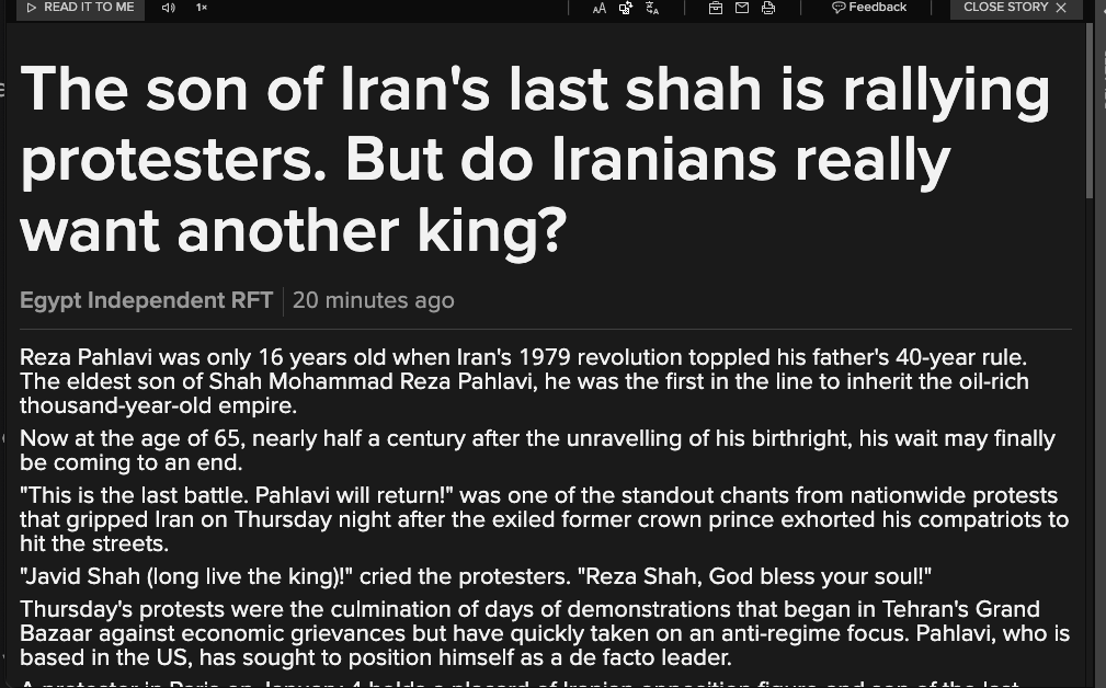 There actually have been mention of “Long live the Shah” in some of the protests. I think its interesting that the Iranians generally regret the fall of the Shah back in 1979, and that his son is living in the US, and has been talking about facilitating regime change in a manner that is consistent with the will of the people. I do believe that there is a credible possibility that all of this has concerted US intelligence involvement; i.e. Trump this week spoke on the son Reza Pahlavi, and called him a nice person